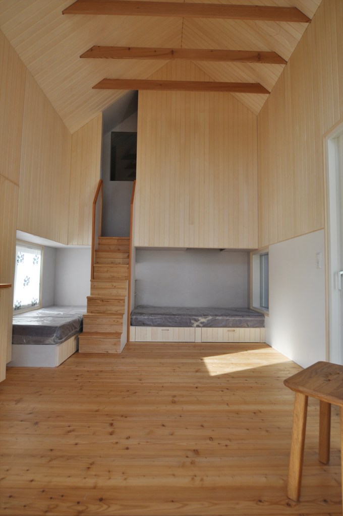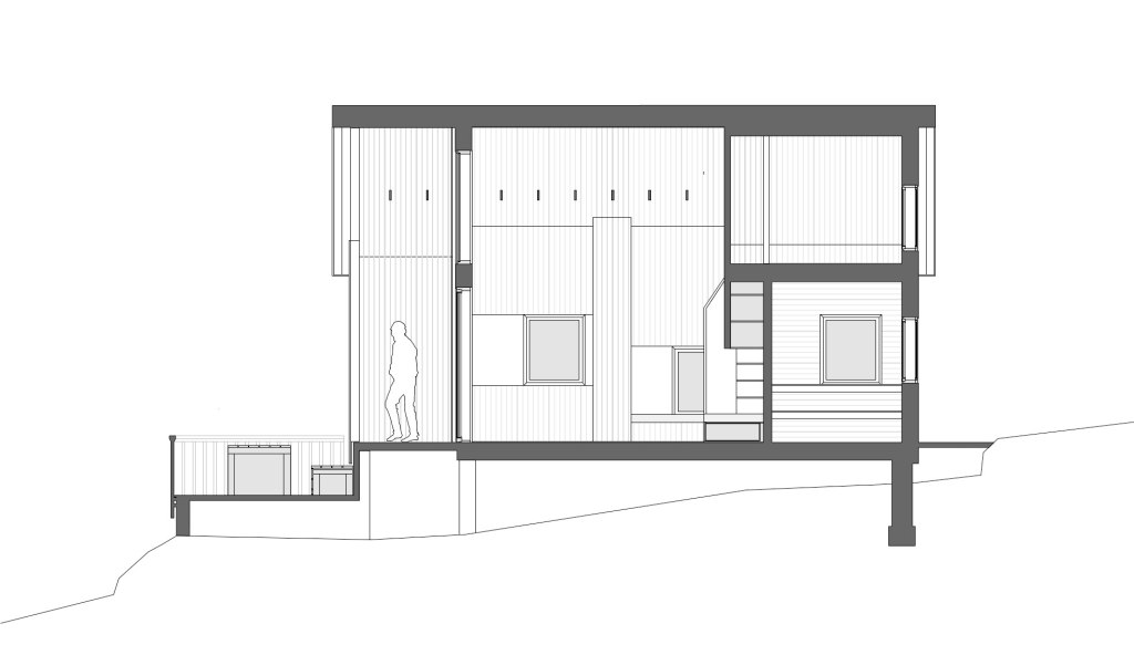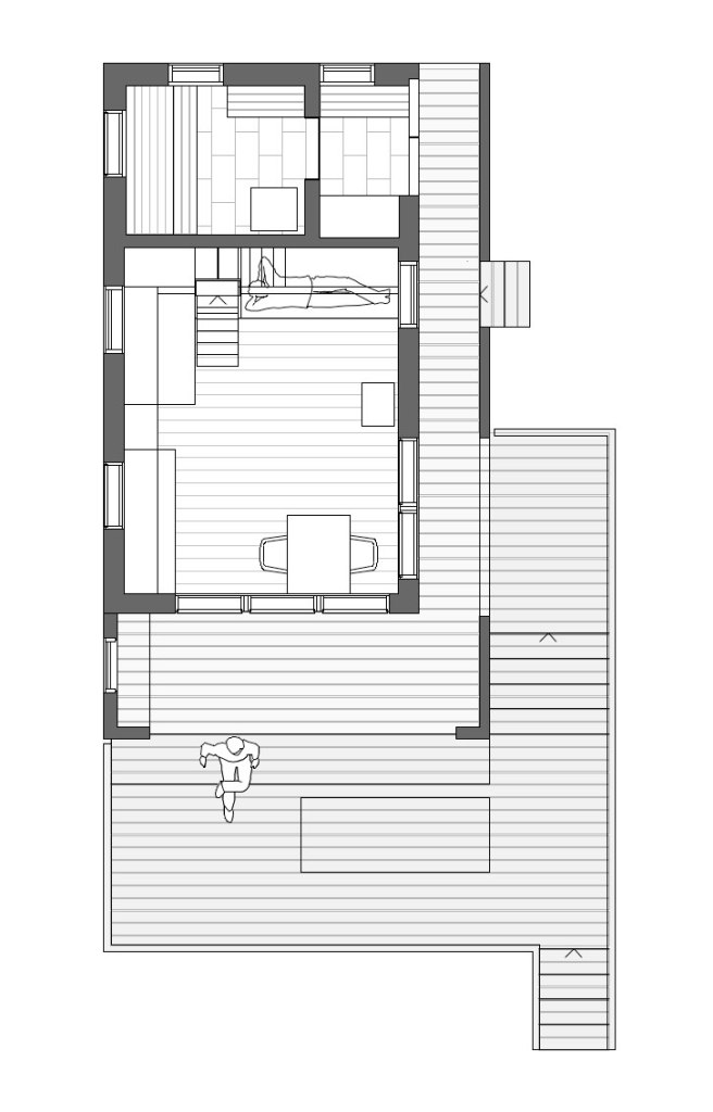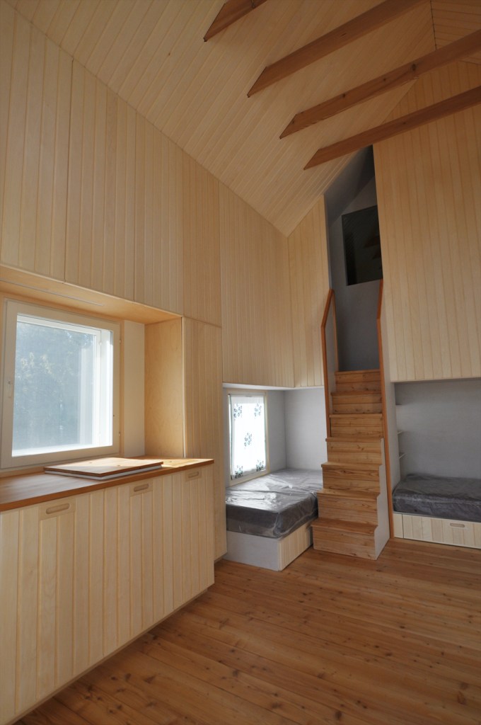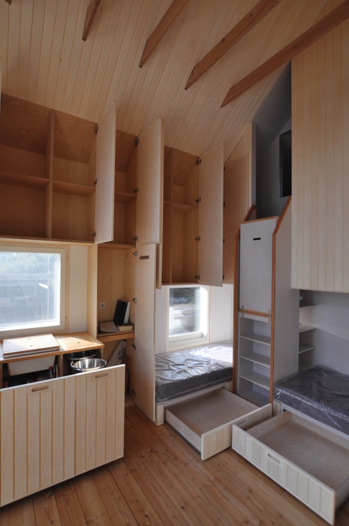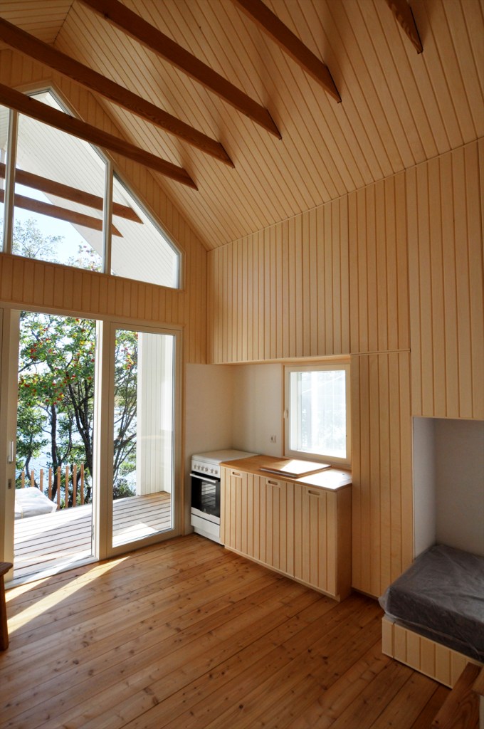 Aber der Ort brachte neben dem schwierigen Baugrund zwei besondere Herausforderungen mit sich. Die erste ist eine baurechtliche: Gebäude, welche bis 15m ans Meeresufergebaut werden, dürfen in der Grundfläche inklusive Wänden maximal 28m2 aufweisen, wovon mindestens ein Drittel Saunafläche sein muss. Der verbleibende Innenraum von 15m2 Fläche muss also so optimal angeordnet sein, dass er als Wohn- /Schlaf- / Koch- und Esszimmer für zwei Personen gut funktioniert, ohne dabei beengend zu wirken. Die Höhe bis in die Dachschräge und die Erweiterung auf eine gedeckte Terrasse gibt ihm Grosszügigkeit. Ausgeklügelte, teilweise multifunktionale Einbaumöbel nutzen den Raum optimal.
