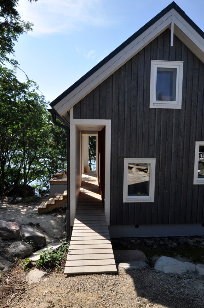Das in Holzbauweise auf massivem Sockel erstellte Sommerhaus steht nahe am Meerufer etwas erhöht auf einer Landzunge, zwischen Erlen und Ebereschen. Das Gebäude nimmt traditionelle Proportionen und Materialen auf und interpretiert sie neu. Es verharkt sich mit der einprägsamen Landschaft, kleinere Fenster setzen bewusst Aussichten, grosse Glasfronten und vorgelagerte Terassen sorgen für einen fliessenden Übergang zwischen Innen und Aussen. Ein wunderschöner Standort mit Blick auf das weite Meer, im Lichtspiel vom Wind raschelnder Blätter.