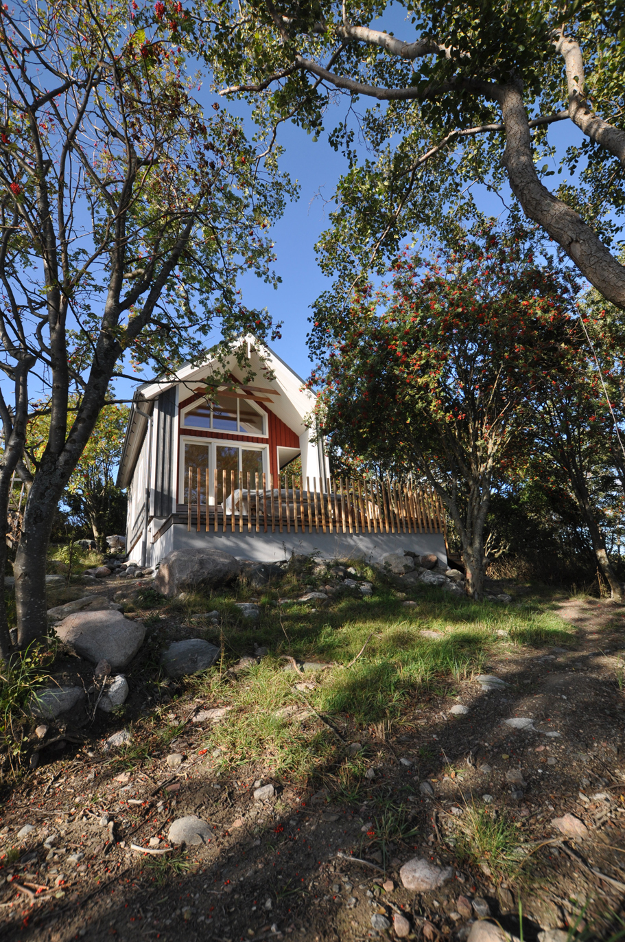 Das in Holzbauweise auf massivem Sockel erstellte Sommerhaus steht nahe am Meerufer etwas erhöht auf einer Landzunge, zwischen Erlen und Ebereschen. Das Gebäude nimmt traditionelle Proportionen und Materialen auf und interpretiert sie neu. Es verharkt sich mit der einprägsamen Landschaft, kleinere Fenster setzen bewusst Aussichten, grosse Glasfronten und vorgelagerte Terassen sorgen für einen fliessenden Übergang zwischen Innen und Aussen. Ein wunderschöner Standort mit Blick auf das weite Meer, im Lichtspiel vom Wind raschelnder Blätter.